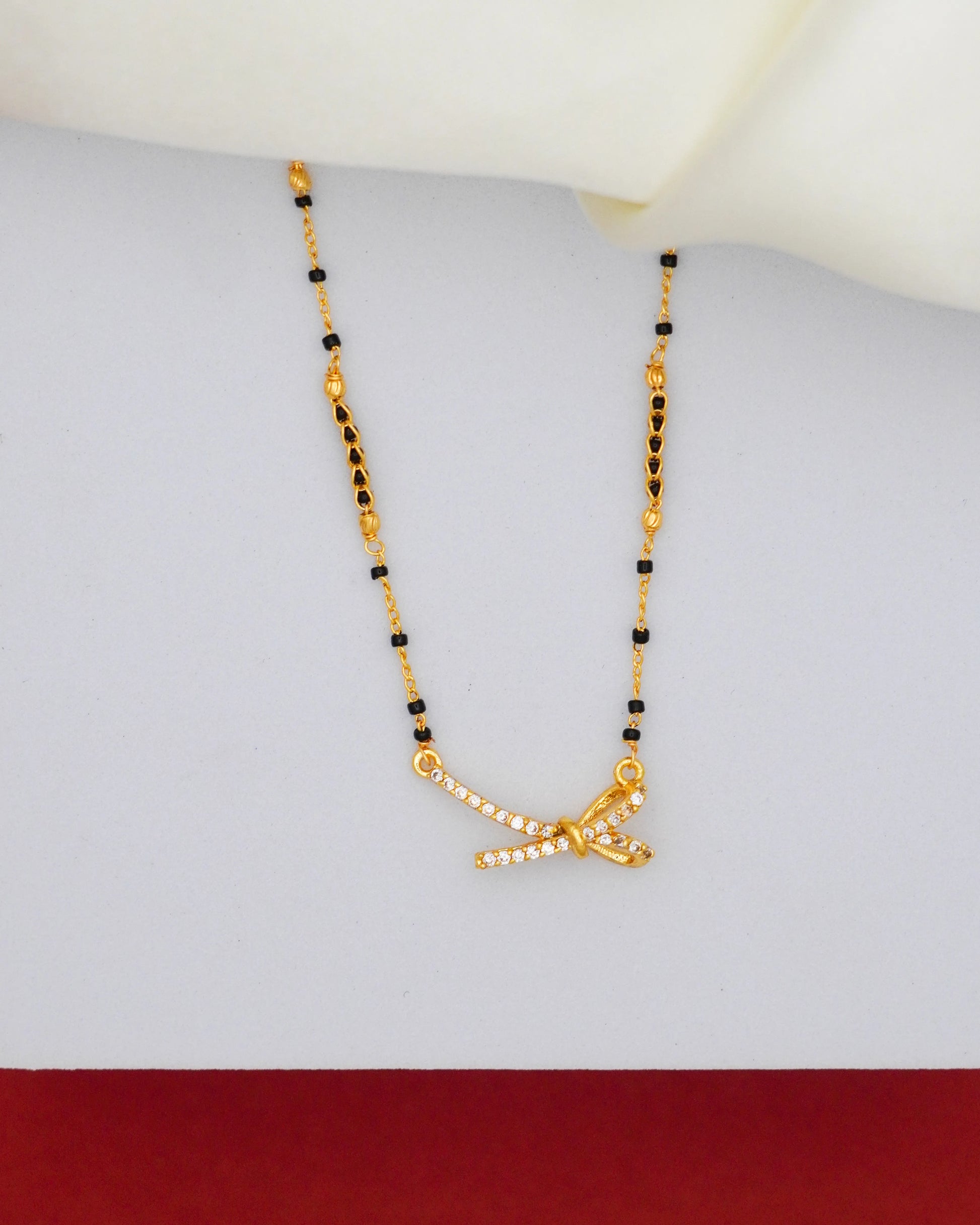 A chic and modern mangalsutra crafted in 18K gold plating, designed with black beads along the chain and a sparkling bow knot pendant at the center. The bow symbol adds a playful yet elegant charm, making it perfect for contemporary brides and everyday wear. Comes in Truffle Premium Packaging.