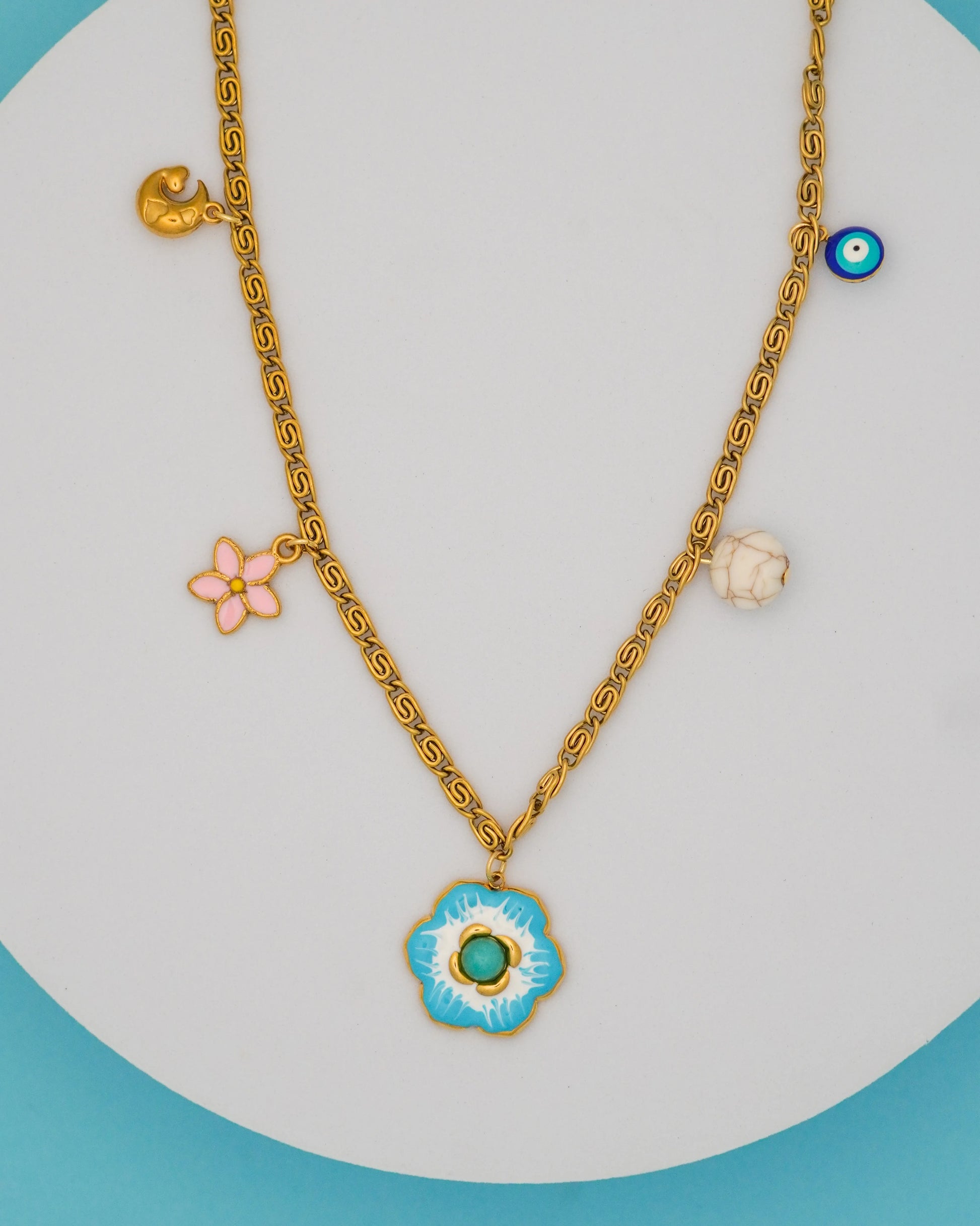 Featuring an artistic mix of charms including a blue floral enamel pendant, pink flower, moon, marble bead, and an evil-eye charm — this necklace brings together color, culture, and creativity. Its intricate gold-plated chain adds a touch of luxe, making it perfect for layering or wearing solo for a statement look.
