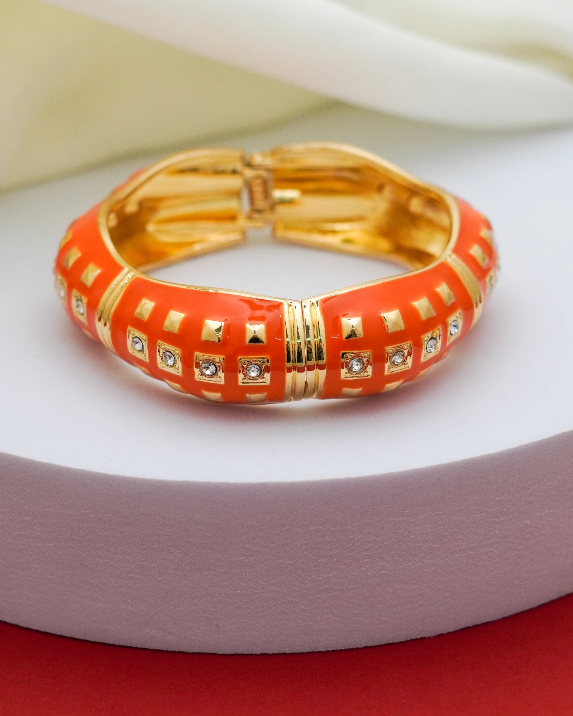 Crafted with a glossy coral-orange enamel finish and embellished with delicate CZ stones, this bracelet perfectly blends luxury and modern sophistication. Its sturdy clasp and smooth edges make it comfortable for all-day wear — ideal for both everyday elegance and festive occasions.
