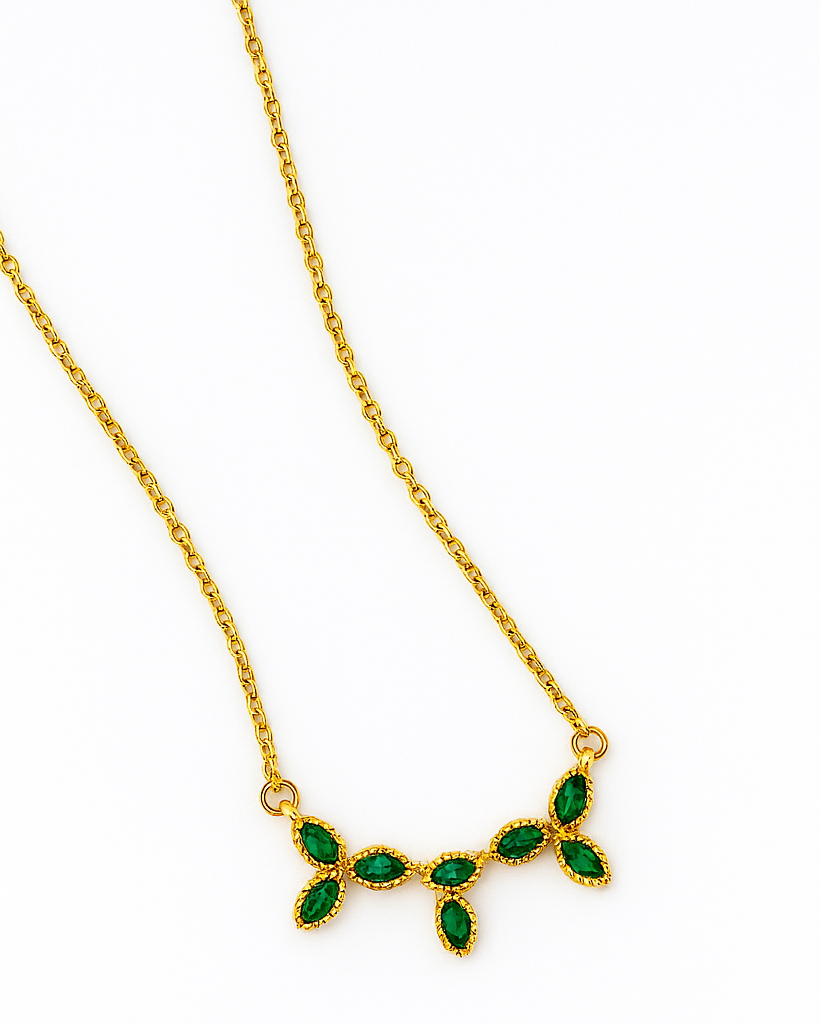 Inspired by the lush beauty of nature, the Emerald Bloom Necklace is a delicate tribute to timeless elegance. Featuring marquise-cut green stones arranged like tiny blooming leaves, this 18K gold-plated necklace adds a refreshing pop of color and charm to any look. Whether worn alone or layered, it’s the perfect piece to express grace with a hint of natural allure.