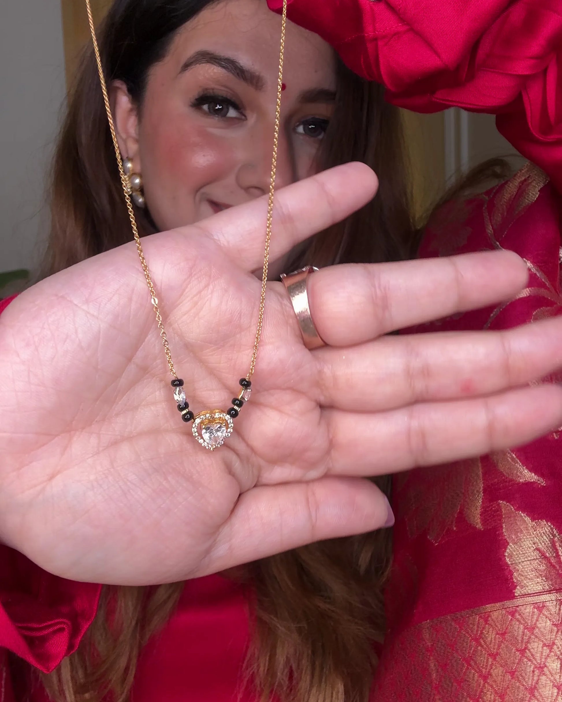Symbol of love and tradition, our Heart Mangalsutra – 18K Gold Plated features a radiant heart-shaped pendant embellished with sparkling stones. Its elegant design with delicate black beads makes it perfect for both everyday wear and special moments. Comes in Truffle Premium Packaging, making it a memorable gift for your loved one.