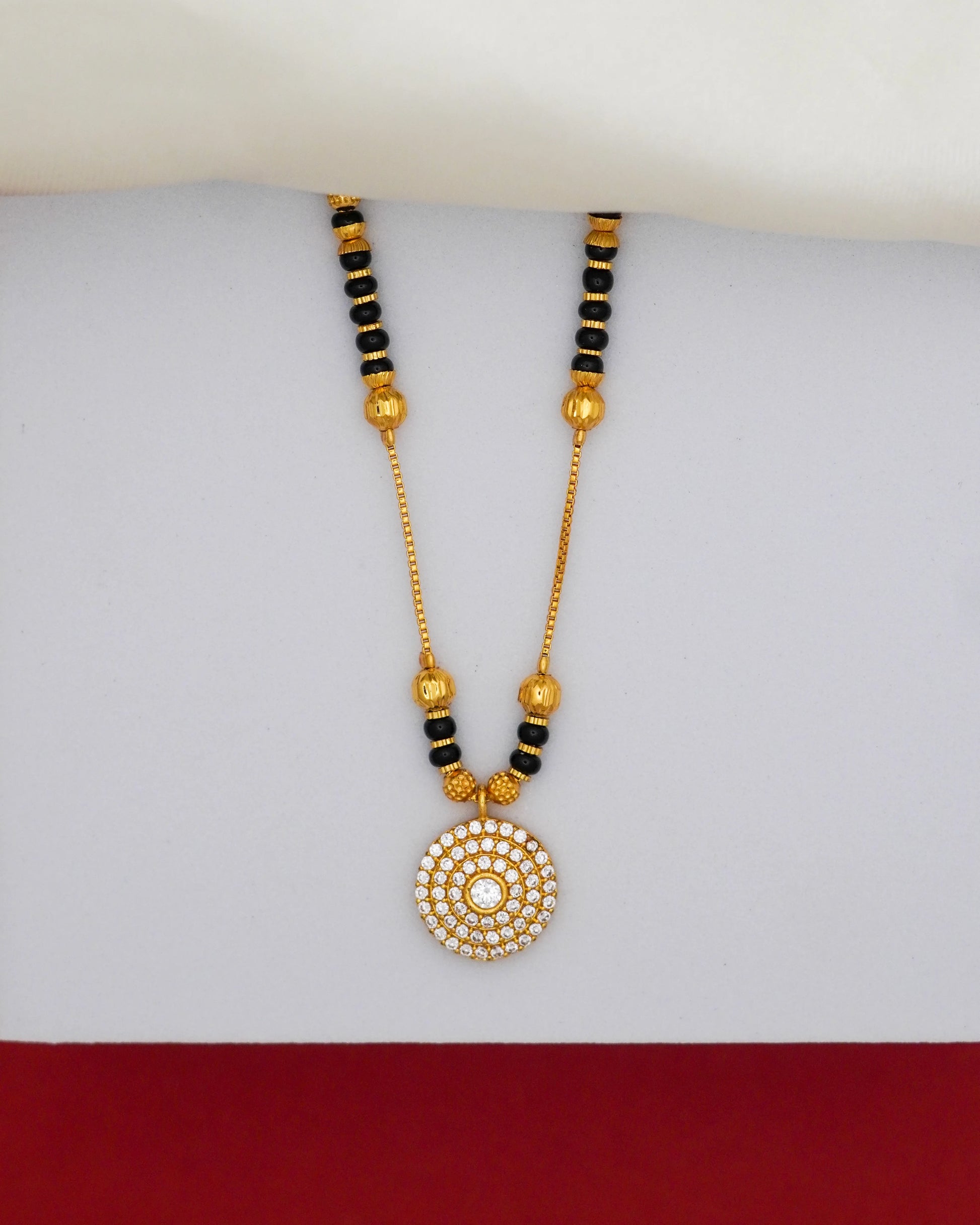 The Golden Aura Mangalsutra shines with timeless elegance and radiant craftsmanship. Its circular pendant, encrusted with multiple layers of sparkling cubic zirconia stones, symbolizes eternal love and unity. Paired with a finely detailed gold-plated chain and traditional black beads, this piece perfectly blends heritage with modern allure — ideal for daily wear or festive occasions.