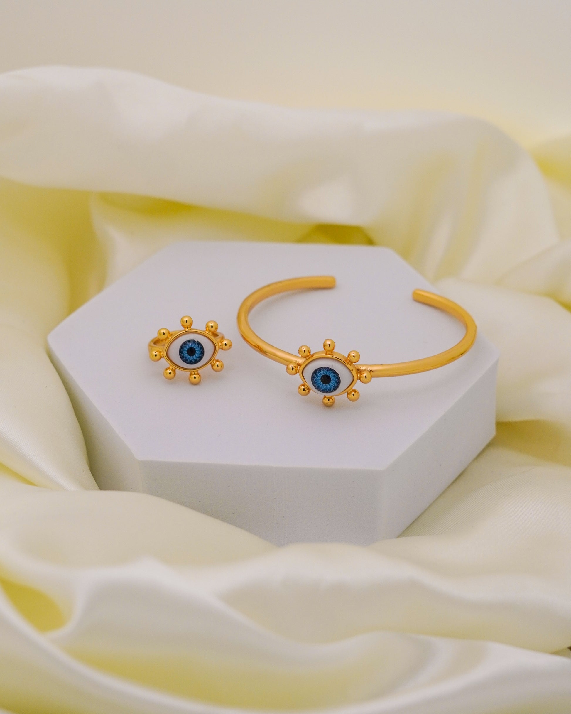 Protect your vibe in style with our Nazar Charm Combo. Featuring a delicately crafted open cuff bracelet and an adjustable ring, both adorned with the symbolic evil eye, this 18K gold-plated set is designed to ward off negativity while adding a touch of elegance to your everyday look.
