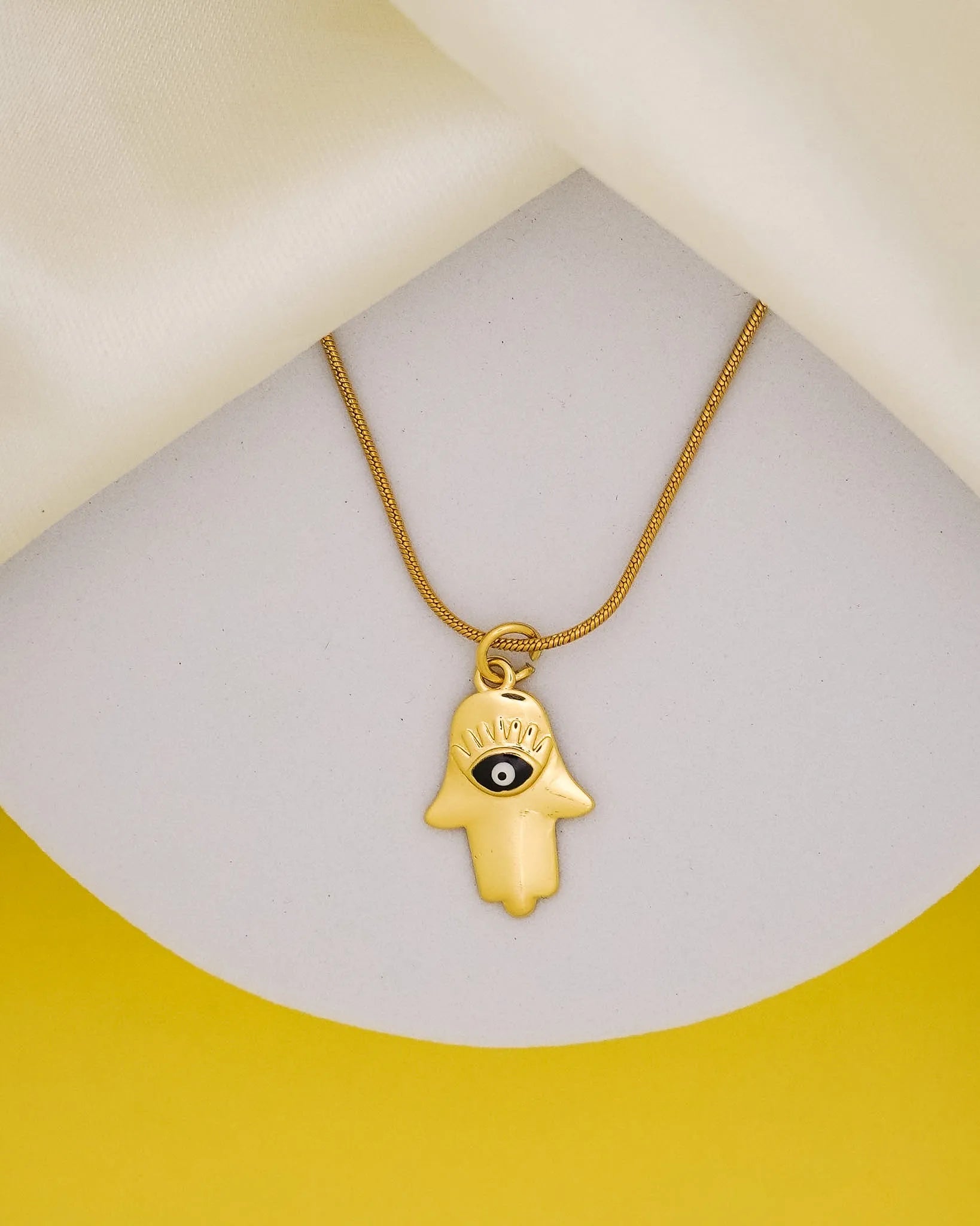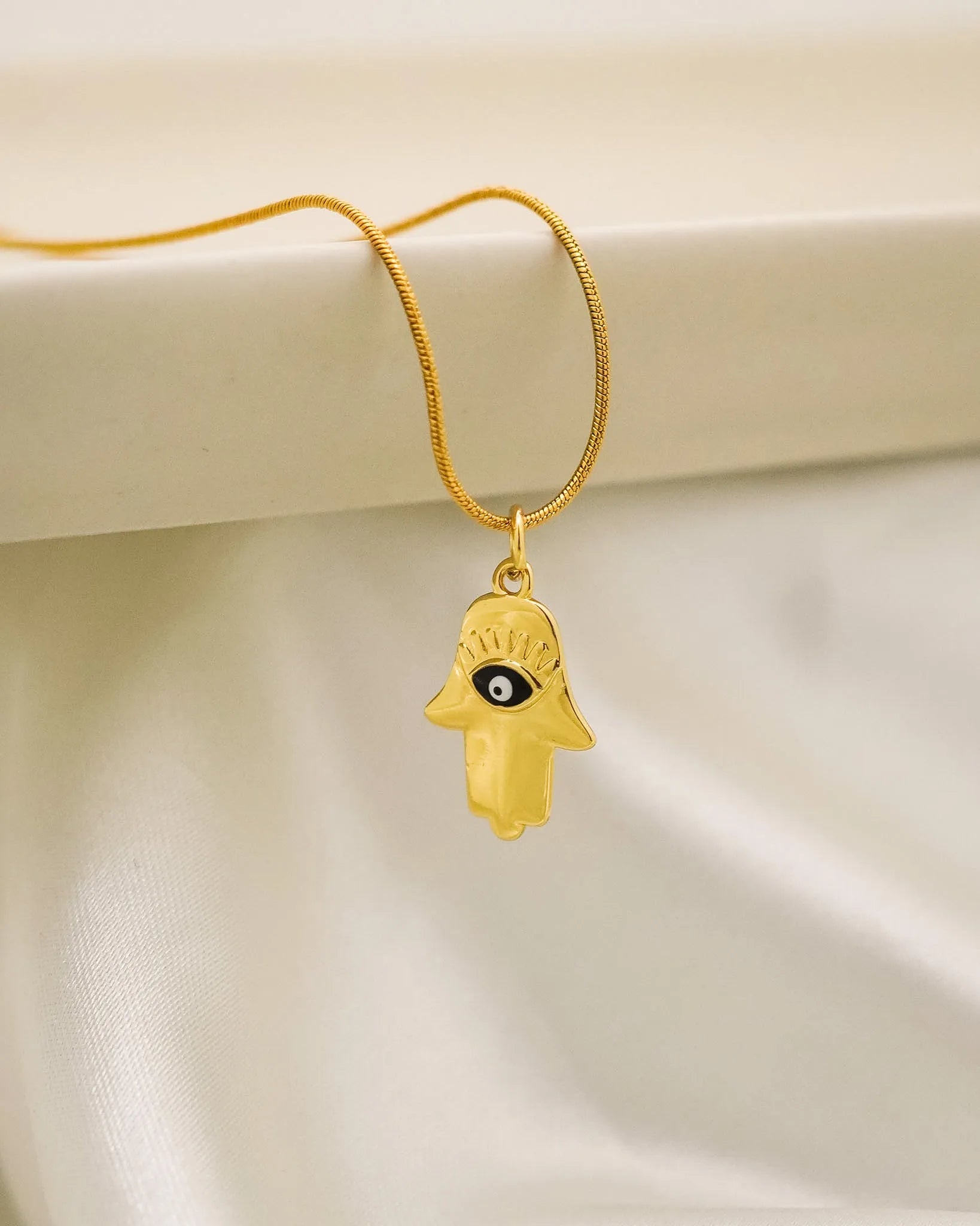 The Noir Palm Necklace features a modern twist on the traditional Hamsa — with a striking black evil eye at the center of a gold palm, symbolizing strength, intuition, and spiritual shielding. Crafted in 18K gold plating over stainless steel and finished with a sleek snake chain, this piece is both edgy and meaningful.