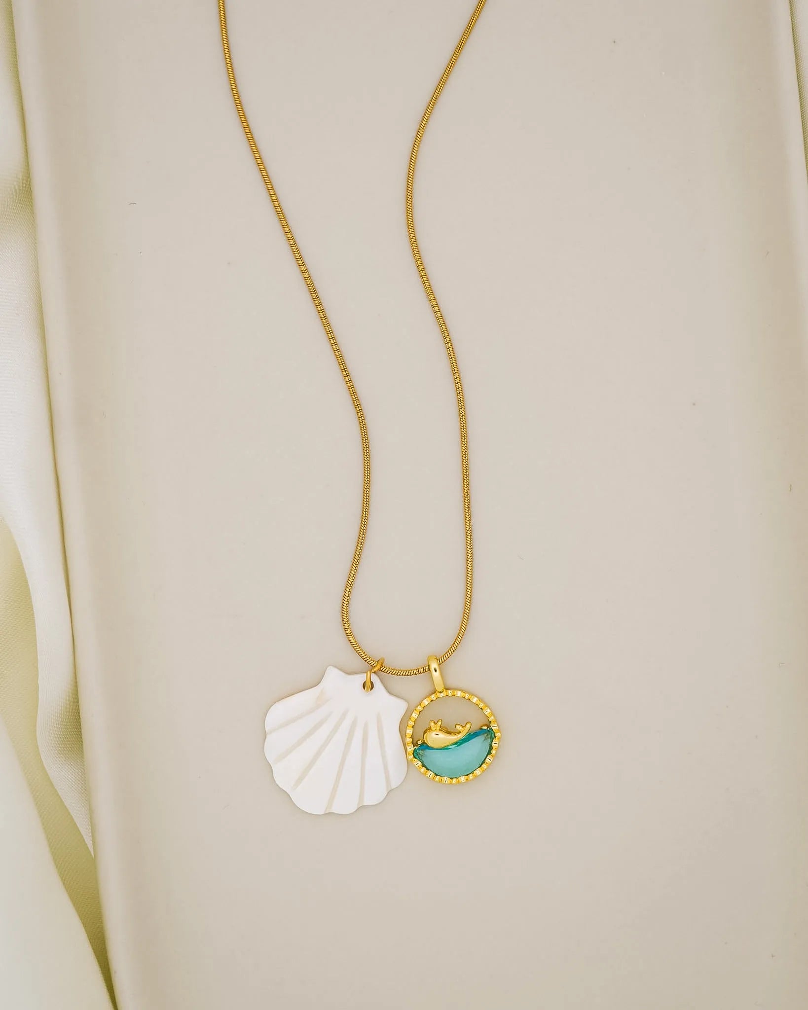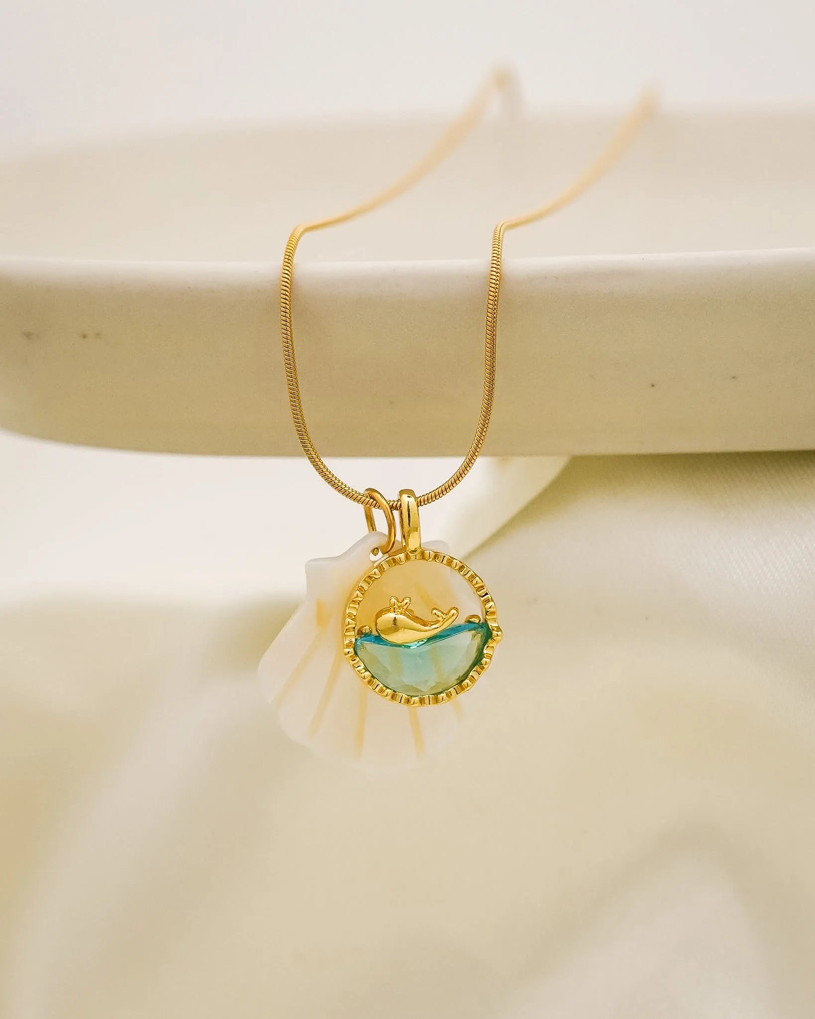 Inspired by the magic of the sea, the Ocean Drift Necklace features a graceful gold whale gliding through translucent blue waters. Paired with an iridescent shell charm, this dreamy piece brings a sense of calm, strength, and wonder — like carrying a little ocean around your neck.
