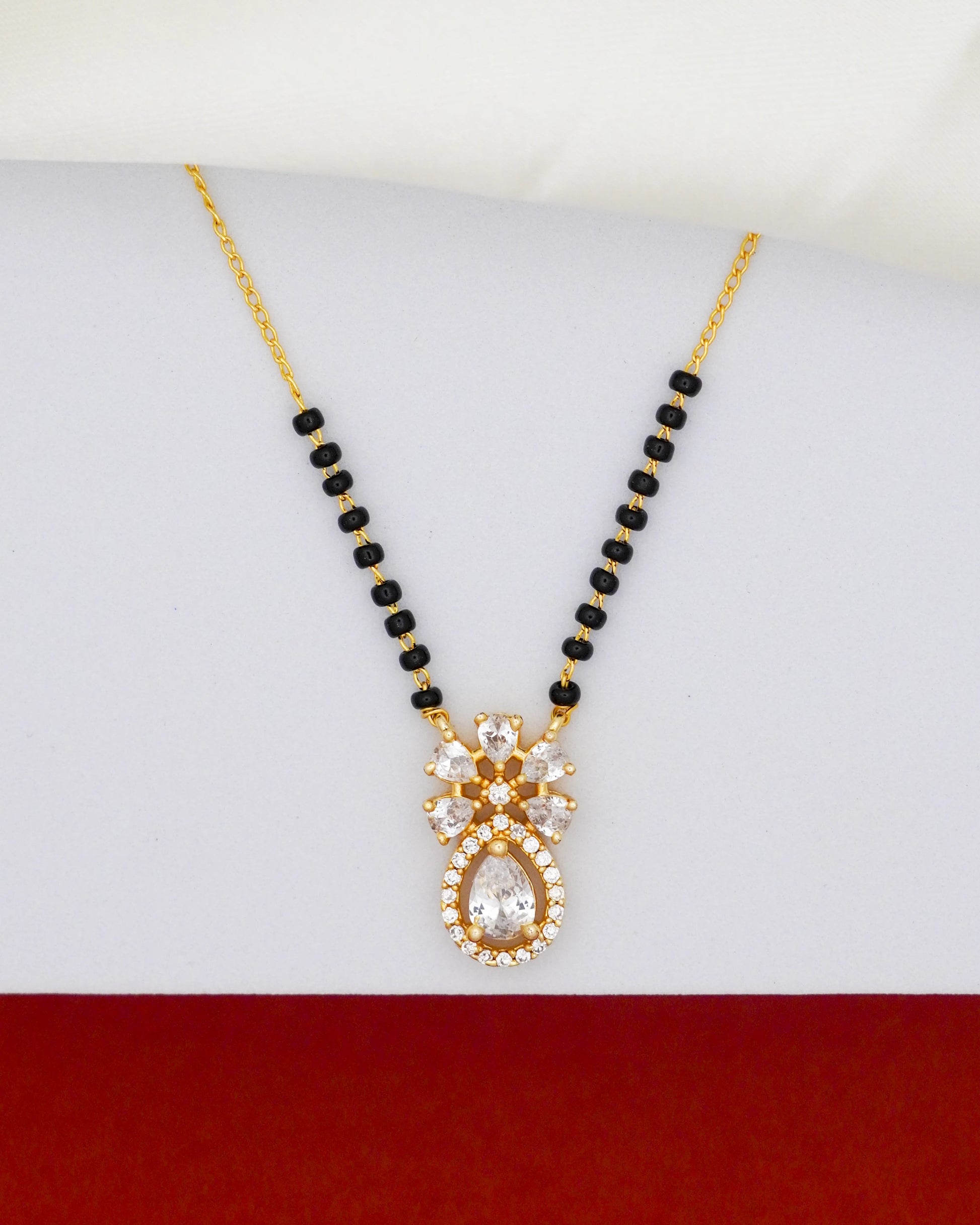 Graceful and captivating, our Radiant Blossom Mangalsutra – 18K Gold Plated features a dazzling teardrop-shaped crystal surrounded by a floral-inspired design. Paired with a traditional black-bead chain, this piece beautifully blends timeless tradition with modern sophistication. Perfect for daily wear or festive occasions, it comes in Truffle Premium Packaging, making it a thoughtful gift for your loved one.
