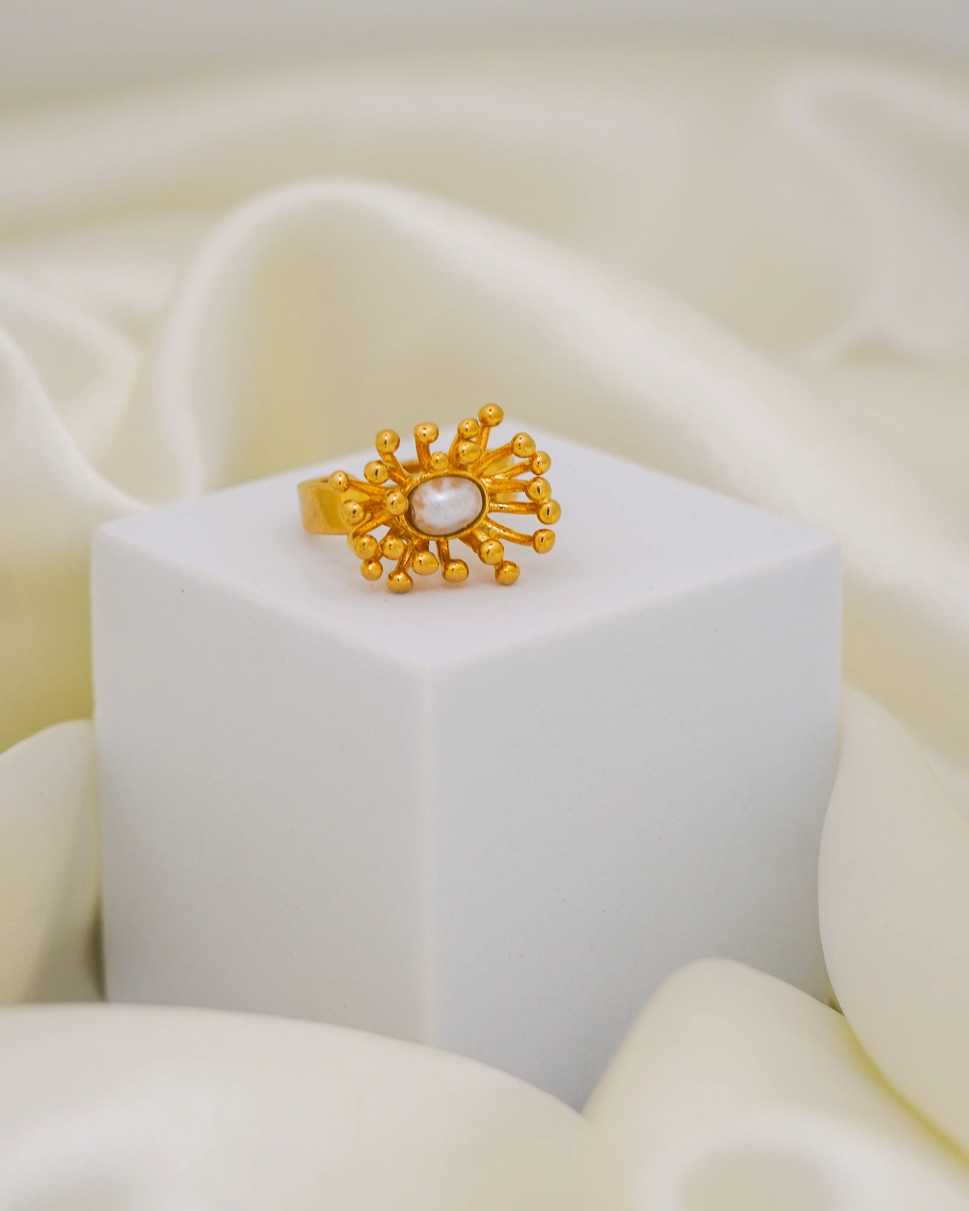 Inspired by golden rays and timeless elegance, the Solstice Pearl Ring is your new statement essential. Featuring a radiant sunburst design and a luminous pearl-like center, this ring captures light — and attention — from every angle.