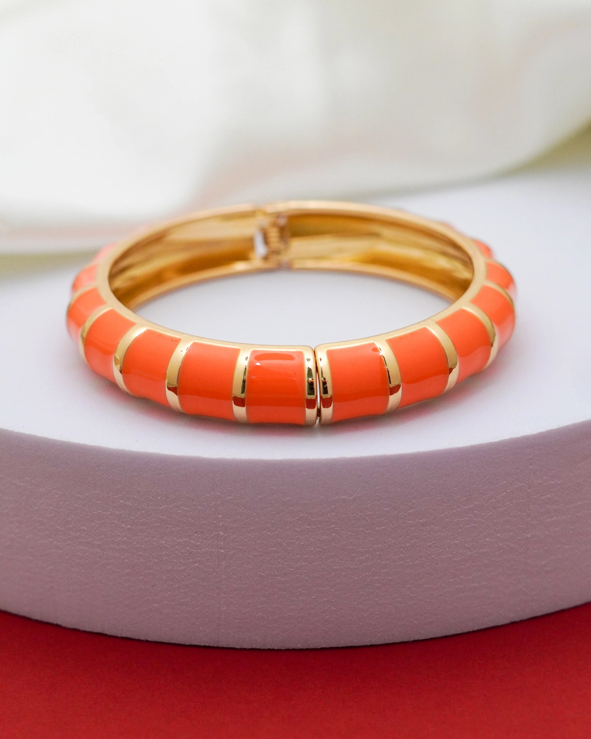 Brighten up your style with the Tangerine Groove Bracelet. Featuring glossy enamel detailing in a vibrant orange shade and finished with 18K gold plating, this bracelet is a bold yet timeless addition to your jewelry collection. Whether styled alone or paired with other bracelets, it adds a playful pop of color to every look. Comes in Truffle Premium Packaging – perfect for gifting or keeping.